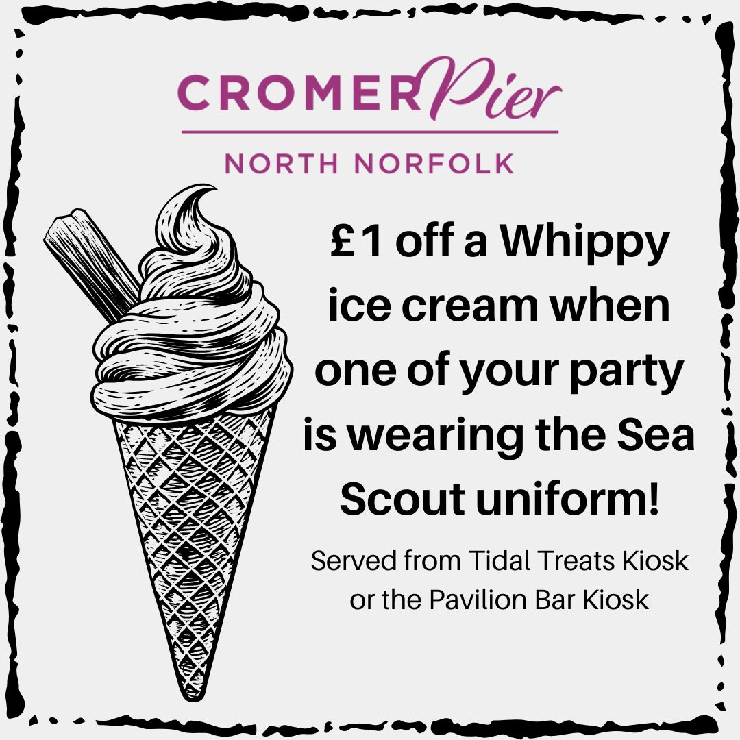 Cromer Pier is a notable landmark, famous for its Cromer Pier Show. On the day of the Parade, they are offering £1 off a Whippy ice cream at either the Tidal Treats shop on the front of the pier or the Pavilion Theatre's bar. More information can be found on this image.